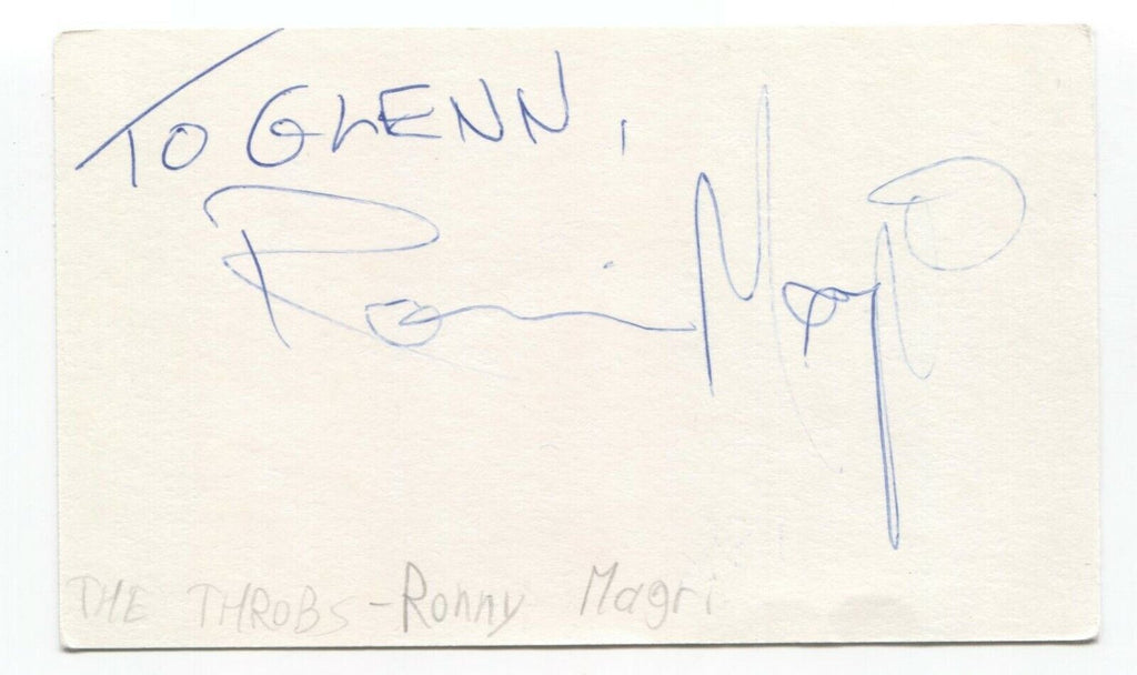 Up for sale is an autographed 3x5 index card, boldly signed by Ronnie Magri, of the band The Throbs. This autograph was part of an enormous collection of over 9000 in person collected signatures.
