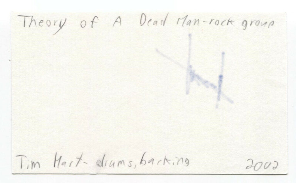 Up for sale is an autographed 3x5 index card, boldly signed by Tim Hart, of Theory of a Deadman.  Autograph was part of an enormous collection of over 9000 in person collected signatures.