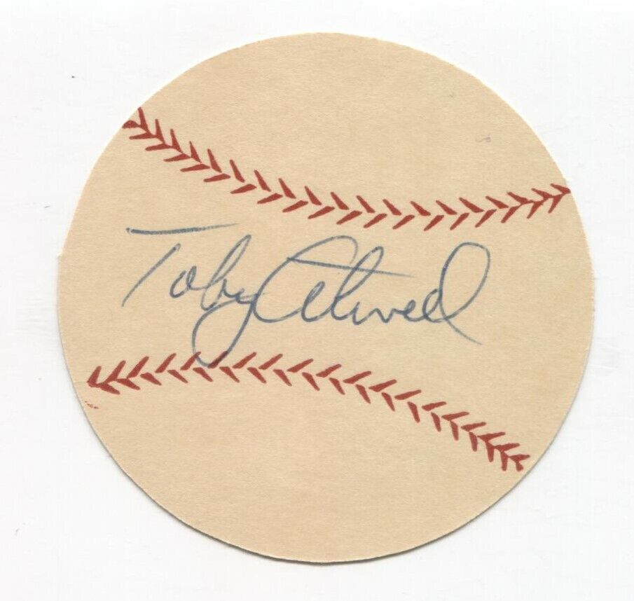 Up for sale is a signed thick paper stock baseball measuring approximately 2.5 inches in diameter, featuring an autograph of Toby Atwell.  The third image (not included with the item) shows the original mailing envelope the autograph was received in, postmarked from 1953.  This autograph was part of a large collection of over 700 vintage baseball autographs and memorabilia, all obtained between 1952 and 1954 by the same original owner.