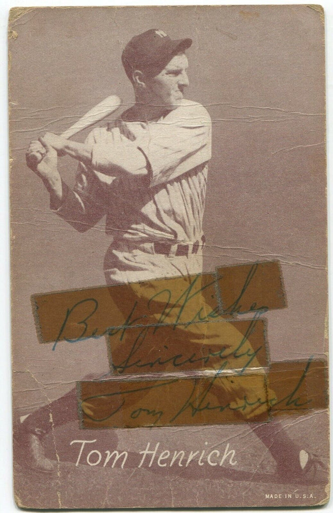 Up for sale is a 1947 Exhibit baseball card of Tommy Henrich, signed in fountain tip pen on the front.  Autograph has a piece of vintage tape applied to it.  Very difficult to find with truly vintage autographs and not modern sharpie examples on this series.    Autograph was part of an original collection of signed baseball cards that were gathered between 1948 and the early 1950's in the New York area.  I was fortunate enough to purchase the collection in it's entirety.