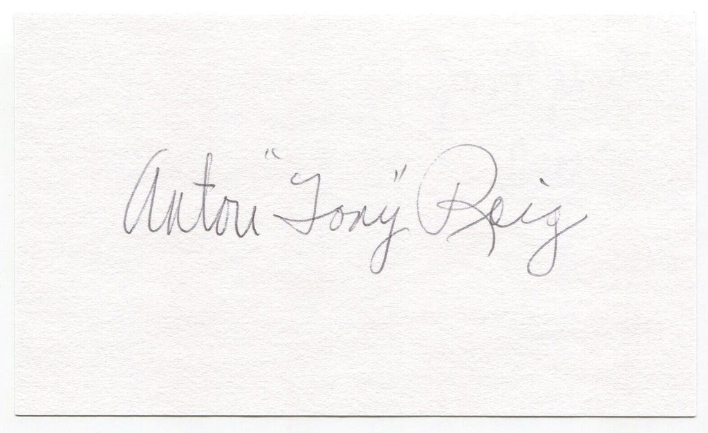 Up for sale is an autographed 3x5 index card, boldly signed by baseball player Tony Roig. Just a great looking autograph that will display nicely. Autograph was part of a huge "MP" Collection, consisting of over 3,000 signed index cards that I was fortunate to purchase in it's entirety.
