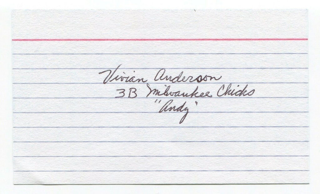 Up for sale is an autographed 3x5 inch index card, boldly signed by AAGPBL baseball player, Vivian Anderson. Autograph was part of the large "Brooks Wyatt" collection of over 700 signatures that I was fortunate to purchase in it's entirety.