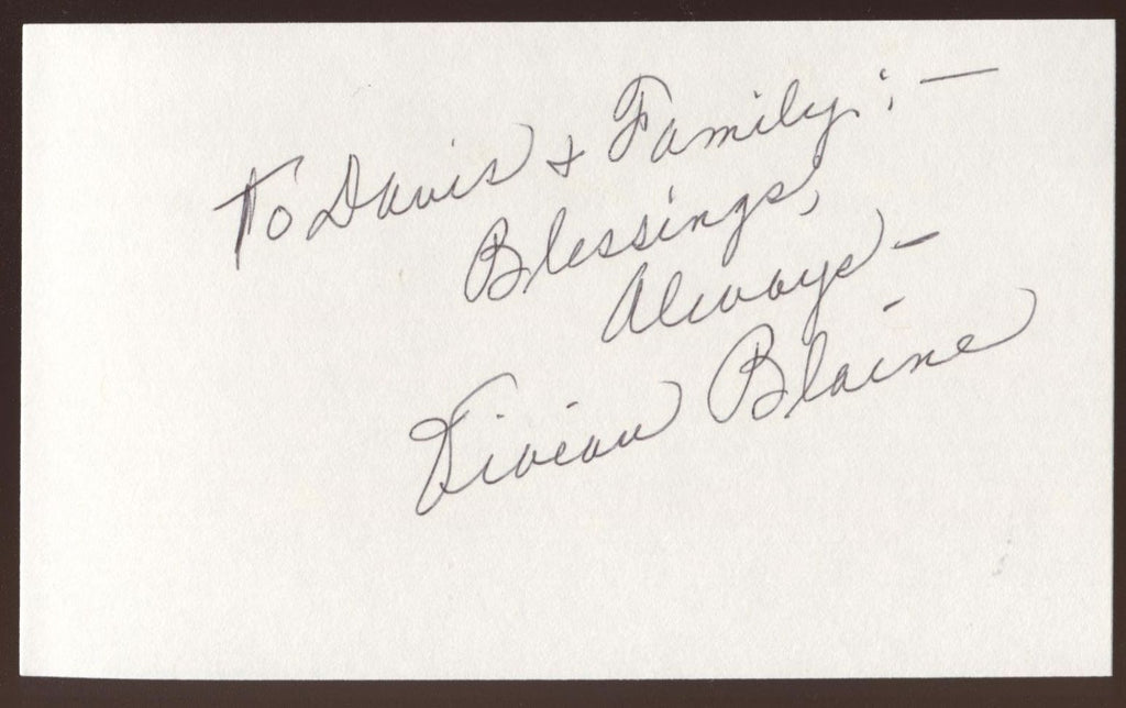 Vivian Blaine Signed Index Card Autographed 1993 Autographed Guys and Dolls