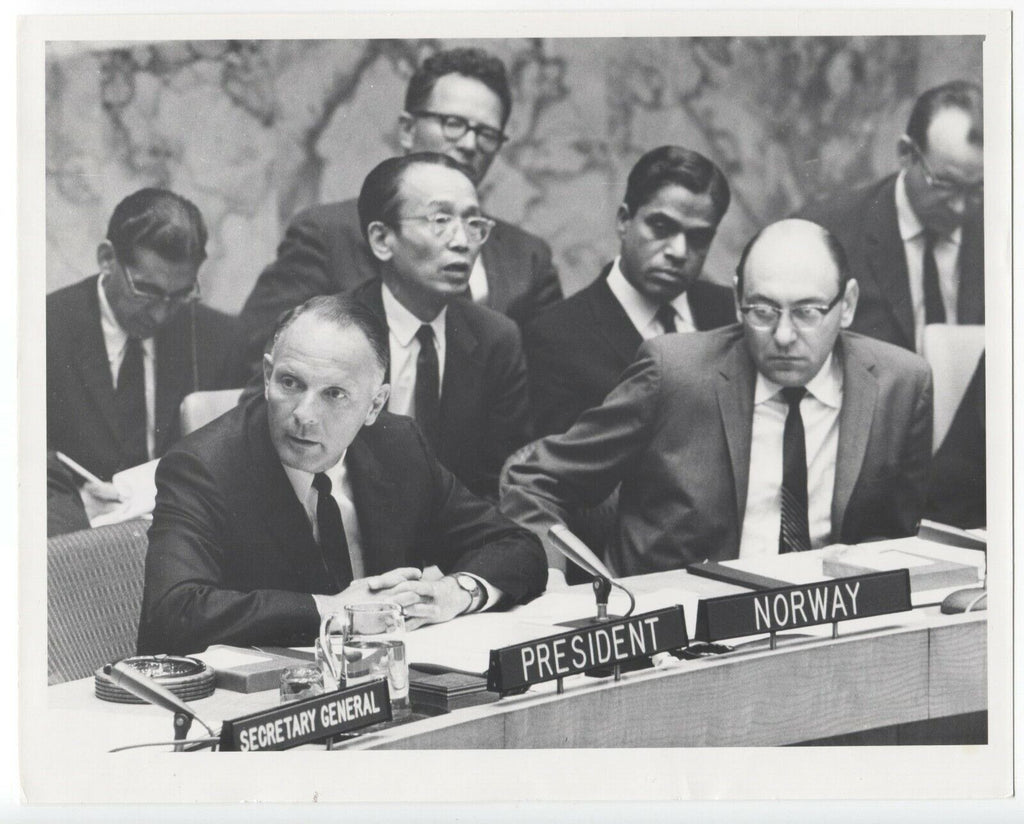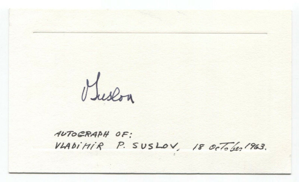 Up for sale is a signed approximately 5.5 x 3.5 inch thick paper card, boldly autographed by delegate Vladimir Suslov. Also includes the two unsigned vintage 8x10 photographs shown in the images. Autograph was part of the well known single owner, original "Roger Harris" collection of thousands of autographs, acquired over many decades of collecting.