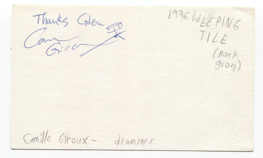 Up for sale is an autographed 3x5 index card, boldly signed by Cam Giroux, of Weeping Tile. Autograph was part of an enormous collection of over 9000 in person collected signatures.