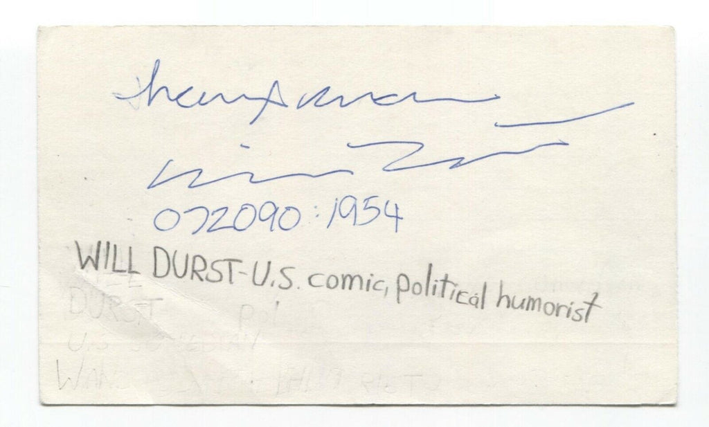 Up for sale is an autographed 3x5 index card, boldly signed by humorist Will Durst. This autograph was part of an enormous collection of over 9000 in person collected signatures.