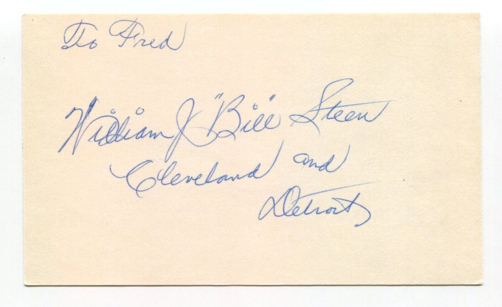 Up for sale is an autographed 3x5 index card, signed by baseball player William "Bill" Steen. Just a great looking autograph that will display nicely. Autograph was part of the JP collection consisting of over 350 autographed index cards.