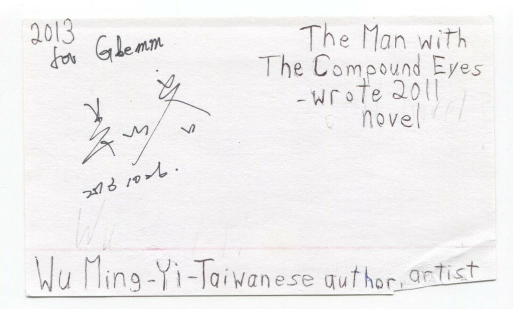 Up for sale is an autographed 3x5 index card, boldly signed by author and activist Wu Ming-yi. This autograph was part of an enormous collection of over 9000 in person collected signatures.