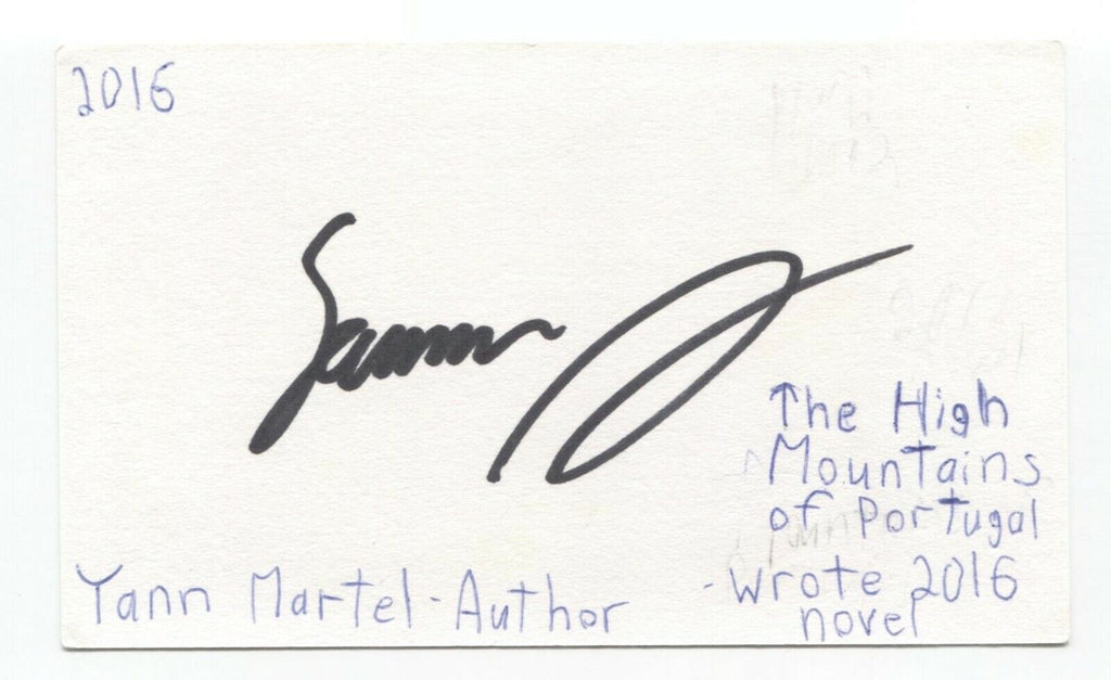 Up for sale is an autographed 3x5 index card, boldly signed by author Yann MartelThis autograph was part of an enormous collection of over 9000 in person collected signatures.